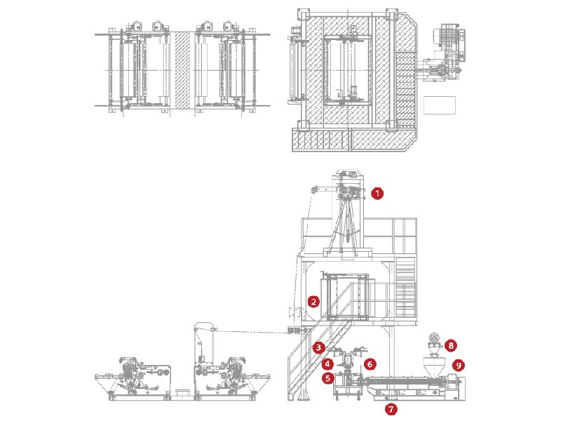 配置: 1)旋轉(zhuǎn)模頭 (600-2500MM), 固定模頭(3000MM) 2)雙收卷 3)壓花輥 (600-800MM) 4)插邊器 選配 1)自動吸料機(jī) 2)冷風(fēng)機(jī) 3)快速換網(wǎng)器/液壓換網(wǎng) 4)自動收卷(單收/雙收卷) 5)氣脹軸 6)牽引升降